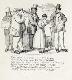 | Keywords: House That Jeff Built p7.jpg en Panel from 1863 cartoon The House That Jeff Built satirizing Jefferson Davis and the slave trade Panel 7 showing slave merchants around a young woman slave; a child slave is in the background Text These buy the slaves both male and female and sell their own souls to a boss with a tail who owns the small soul of that thing call ™d a man whose trade is to sell all the chattels he can from yearlings to adults of life ™s longest span in and out of the house that Jeff built The boss with a tail refers to the Devil 1863-07 The House That Jeff Built 1863 cartoon David Claypoole Johnston other versions PD-old-70-1923 Fashion in 1863 The House That Jeff Built Slave trade in the United States |