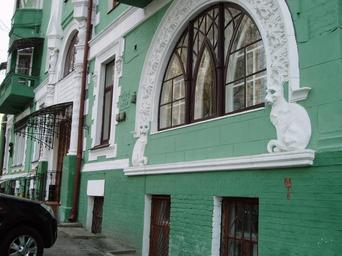| Keywords: House with cats Kyiv 03.jpg en An arched window at the ground floor of the House with Cats in Kyiv guarded by two cats respectively А очне вікно на пе шому пове сі Будинку з котами у Києві що охо оняється двома котами 80-391-0253 Own Martofliak 2009-04-05 own work Arch windows Semi-circular arches House with Cats Art Nouveau architecture in Ukraine |