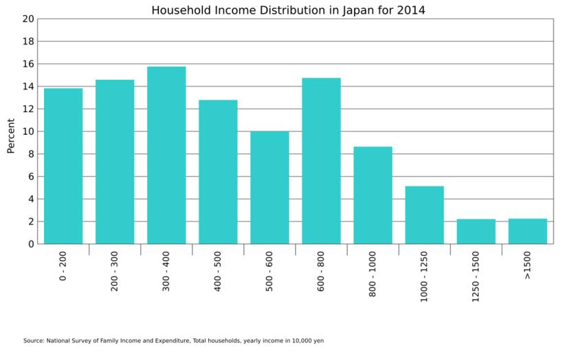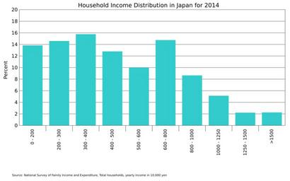| Keywords: Household income distribution in Japan.svg translate yes en Distribution of household income in Japan in 2014 in 10 000 yen Source http //www e-stat go jp/SG1/estat/ListE do bid 000001065106 cycode 0 National Survey of Family Income and Expenditure 2016-05-26 own Delphi234 other versions cc-zero Income distribution Economy of Japan |