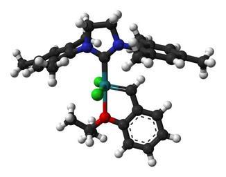| Keywords: Hoveyda-Grubbs-catalyst-from-xtal-2007-3D-balls.png Ball-and-stick model of a molecule of the Hoveyda-Grubbs second generation catalyst C<sub>31</sub>H<sub>38</sub>Cl<sub>2</sub>N<sub>2</sub>ORu i e RuCl<sub>2</sub> C<sub>21</sub>H<sub>26</sub>N<sub>2</sub> CH “C<sub>6</sub>H</sub> “OiPr Colour code 393939 Carbon C grey-black FFFFFF Hydrogen H white 20F020 Chlorine Cl green 2F2FD7 Nitrogen N blue F00000 Oxygen O red 238E97 Ruthenium Ru turquoise Structure determined by X-ray crystallography reported in http //dx doi org/10 1002/adsc 200600478 Adv Synth Catal 2007 349 193 “203 ABEJUM01 Model manipulated in http //www crystalmaker com/ CrystalMaker 8 5 Image generated in http //accelrys com/products/discovery-studio/visualization/discovery-studio-visualizer html Accelrys DS Visualizer Own 2012-06-09 Ben Mills Benjah-bmm27 Images by Ben Mills Hoveyda-Grubbs catalyst |