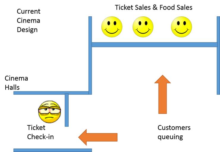 Keywords: Golden village already merge food n ticket sales in one booth. Another area B for quick online ticketing n normal ticket check in. Y not merge food n Ticket sales booth A with ticket entry booth B into one long area so that less staff can man more area. Ticket entry booth B guy has nothing to do at 31 dec 10.56 am at City square mall. Future cinema design: Think off peak man power allocation. If Unable to change current cinema architecture. Ticket entry staff can move to food n ticket sales counter to assist n learn the ropes if it is not 15 mins before or 25 mins after movie entry time. retail melbourne australia