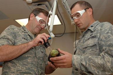 | Keywords: How to Use a Carbon dioxide Fractional Laser in the Dermatology.jpg U S Air Force Lt Col Chad Hivnor right a doctor and the associate director of dermatology with the 59th Medical Wing uses an eggplant to show Lt Gen Douglas Owens the vice commander of Air Education and Training Command how to use a carbon dioxide fractional laser in the dermatology department at Wilford Hall Medical Center on Lackland Air Force Base Texas Oct 1 2010 Owens was visiting Airmen with the wing for the first time since becoming vice commander of the command DoD photo by Staff Sgt Robert Barnett U S Air Force/Released 2010-10-01 12 30 46 https //www flickr com/photos/39955793 N07/5054774730/ U S Department of Defense other versions PD-USGov Dermatology |