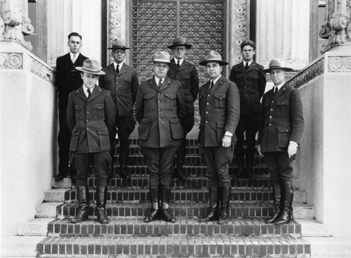 | Keywords: west virginia westvirginia united states of america unitedstatesofamerica blackandwhite monochrome black and white National Park Service Ranger Naturalists at the First Park Naturalist Conference, November, 1929. The photograph is taken in front of one of the entrances to Hilgard Hall, University of California, Berkeley. Pictured are Front Row, l-r: Dorr G.Yeager, Park Naturalist, Yellowstone National Park; Carl P. Russell, Field Naturalist of the National Park Service; Ansel F. Hall, Chief Naturalist of the National Park Service; C.A. "Bert" Harwell, Park Naturalist, Yosemite National Park. Back Row, l-r: C. Frank Brockman, Park Naturalist, Mount Rainier National Park; John D. Coffman, Fire Control Expert of the National Park Service (later Chief Forester of the National Park Service; Frank Been, Park Naturalist (at the time Acting Park Naturalist) and Park Forrester , Sequoia National Park; Edwin D. "Eddie" McKee, Park Naturalist, Grand Canyon National Park. Note: George C. Ruhle, Park Naturalist, Glacier National Park, alos attended the conference, but is not pictured. National Park Service photograph by George A. Grant; Negative Number WML-B-125 National Park Service Ranger Naturalists at the First Park Naturalist Conference, November, 1929. The photograph is taken in front of one of the entrances to Hilgard Hall, University of California, Berkeley. Pictured are Front Row, l-r: Dorr G.Yeager, Park Naturalist, Yellowstone National Park; Carl P. Russell, Field Naturalist of the National Park Service; Ansel F. Hall, Chief Naturalist of the National Park Service; C.A. "Bert" Harwell, Park Naturalist, Yosemite National Park. Back Row, l-r: C. Frank Brockman, Park Naturalist, Mount Rainier National Park; John D. Coffman, Fire Control Expert of the National Park Service (later Chief Forester of the National Park Service; Frank Been, Park Naturalist (at the time Acting Park Naturalist) and Park Forrester , Sequoia National Park; Edwin D. "Eddie" McKee, Park Naturalist, Grand Canyon National Park. Note: George C. Ruhle, Park Naturalist, Glacier National Park, alos attended the conference, but is not pictured. National Park Service photograph by George A. Grant; Negative Number WML-B-125 |