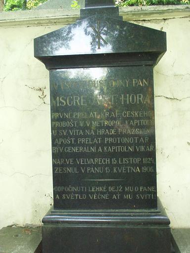 Keywords: Hrob Antonína Hory detail.jpg en grave of monsignor Antonín Hora detail - Šárka cemetery in Prague cs hrob msgre Antonína Hory na hřbitově Šárka v Praze detail own ABC2 2009-05-16 Hřbitov Šárka