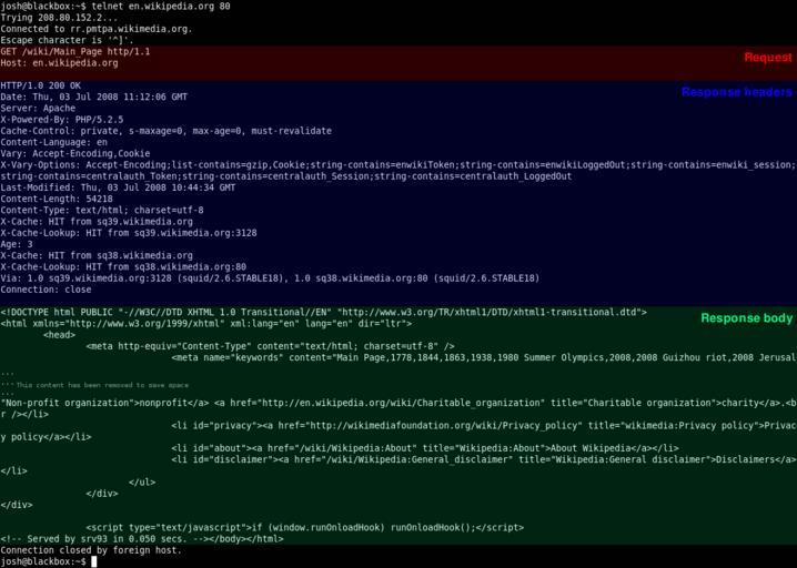 | Keywords: Http request telnet ubuntu.png HEAD http //tcm telkomsel com HTTP/1 1 en A screen shot of the terminal in Ubuntu showing a telnet session that contains a HTTP request/response made to the main page on the English Wikipedia Part of the response has been removed The 3 major parts of the request and response have been highlighted Request Response headers Response body Own TheJosh 2008-07-03 <gallery> File RequĂȘte HTTP png HTTP request in French </gallery> Free terminal emulators Hypertext Transfer Protocol Telnet English screenshots of Ubuntu |