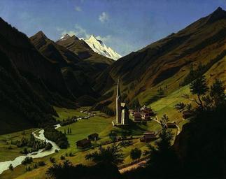 Keywords: hubert sattler landscape painting art artistic artistry oil on canvas sky clouds trees nature outside scenic country countryside mountains valley snow village stream water forest woods