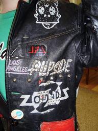 | Keywords: Hudley'sjacket.jpg en Leather jackets were worn by some punk rockers This is Hudley Flipside's jacket The Flipside Logo was Flipside Fanzine's Logo Hudley co-owned edited and published the punk rock fanzine during the 1980's Own Holly Cornell 1980 no Leather jackets |