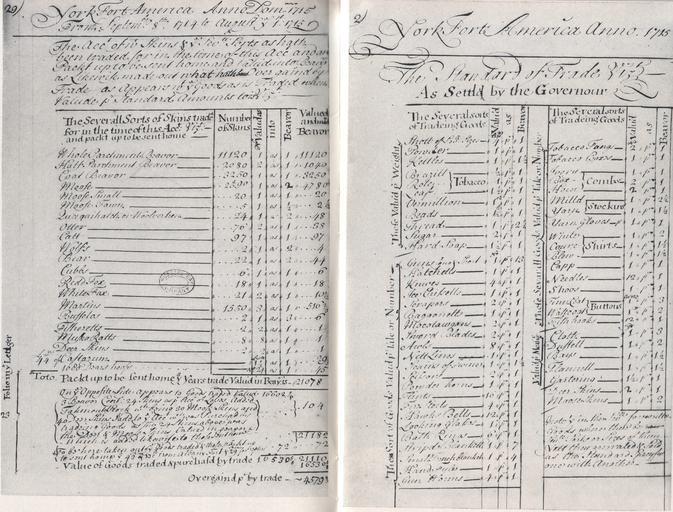 | Keywords: Hudson's Bay Company. List of skins tradet from Sept. 8th, 1714 to Aug. 1st, 1715 and Standard of trade decreed, by Governor James Knight in 1715.jpg right Standard of trade decreed by Govenor James Knight in 1715 Baggonetts are probably bayonets Mocotawgons are curved knives still used by Indians Bays is baize Note that deer and moose skins are listed among the trading goods The Beaver Winter 1957 - York Factory Issue Hudson's Bay Company Winnipeg Canada Pages 14 15 / Collection G C Franke 1715 Hudson's Bay Company PD-old-100 Fur trading values Hudson's Bay Company Moose hides Deer skins Beaver fur-skins Red fox fur-skins Polar fox fur-skins Marten fur-skins Bear fur-skins Bison fur-skins Wolverine fur-skins York Factory Manitoba Ledgers The Beaver Fur fashion in 1715 |