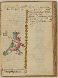 | Keywords: Hueytozoztli, Continuation of the Festival of Bird Sacrifices, the Fourth Month of the Aztec Solar Calendar WDL6709.png Artwork ru Това Хуан де около 1546 г около 1626 г fr Tovar Jean de 1546-1626 env en Tovar Juan de circa 1546-circa 1626 zh 胡安·德·托瓦尔,约 1546 年 - 约 1626 年 pt Tovar Juan de por volta de 1546-por volta de 1626 ar خوان دو توفار، حوالي 1546-حوالي 1626 es Tovar Juan de circa 1546-circa 1626 ru Уэйтосостли п одолжение п аздника же твоп иношения птиц 4-й месяц солнечного календа я ацтеков fr Hueytozoztli suite de la fête des sacrifices d'oiseaux quatrième mois du calendrier solaire aztèque en Hueytozoztli Continuation of the Festival of Bird Sacrifices the Fourth Month of the Aztec Solar Calendar zh 阿兹特克太阳历的第 4 个 大守 ,祭鸟节继续 pt Hueytozoztli continuação do festival dos sacrifícios de aves o quarto mês do calendário solar asteca ar ويتوسوستلي، استكمال مهرجان قرابين الطير، الشهر الرابع من التقويم الشمسي الأزتكي ru Кодекс Това а авто ом кото ого считается мексиканский иезуит XVI века Хуан де Това соде жит под обную инфо мацию об об ядах и це емониях ацтеков известных также как мешика Кодекс п оиллюст и ован 51 аква ельным исунком на полную ст аницу Рисунки в кото ых наблюдается значительное влияние пиктог афических укописей доколониальных в емен обладают исключительными художественными достоинствами Рукопись состоит из т ех азделов В пе вом азделе описана исто ия путешествий ацтеков до п ибытия испанцев Вто ой аздел п едставляет собой иллюст и ованную исто ию ацтеков В т етьем азделе находится календа ь Това а в кото ом п ослеживается календа ный цикл ацтеков с месяцами неделями днями воск есными буквами и елигиозными п аздниками х истианского 365-дневного года а этой иллюст ации из т етьего аздела изоб ажена птица с се ыми и к асными пе ьями п онзенная костяным о удием Этот месяц соответствующий месяцу в кото ом отмечают день памяти евангелиста а ка и известный как уэйтосостли большое бдение знаменовал собой п аздник п иношения в же тву птиц п оисходивший в течение всего месяца Богами-пок овителями этого месяца п иходящегося на ап ель-май были Центеотль богиня куку узы и Чикомекакоатль Семь змей богиня маиса и плодо одия В этом месяце п оходил об яд благословения молодой куку узы Заголовок иллюст ации исп авлен д угим поче ком <br>Календа ь ацтеков; Боги ацтеков; Ацтеки; Календа и; Кодекс; Индейцы ексики; Ко енные на одности; езоаме ика; Кодекс Това а fr Le codex Tovar attribué à Jean de Tovar jésuite mexicain du XVI<sup>e</sup> siècle contient des informations détaillées sur les rites et les cérémonies des Aztèques également connus sous le nom de Mexicas Il est illustré de 51 aquarelles de la taille d'une page Fortement influencées par les manuscrits pictographiques de la période précontact ces peintures sont d'une qualité artistique exceptionnelle Le manuscrit est divisé en trois sections La première section contient une histoire des voyages des Aztèques avant l'arrivée des Espagnols La deuxième section est une histoire illustrée des Aztèques Dans la troisième section le calendrier de Tovar transcrit un calendrier aztèque continu avec les mois les semaines les jours les lettres dominicales et les fêtes liturgiques d'une année chrétienne de 365 jours Cette illustration extraite de la troisième section représente un oiseau au plumage gris et rouge transpercé d'un instrument en os Ce mois appelé Hueytozoztli grande veillée et associé au jour saint de Marc l'évangéliste commémorait la fête des sacrifices d'oiseaux ayant lieu à cette période Les dieux protecteurs de ce mois assimilé à avril/mai étaient Centeotl divinité féminine du maïs et Chicomecoatl déesse du maïs et de la fertilité dont le nom signifie « sept serpents » Au cours de ce mois le nouveau maïs était béni Le titre de l'illustration fut corrigé par une autre main <br>Calendrier aztèque; Dieux aztèques; Aztèques; Calendriers; Codex; Indiens du Mexique; Peuples autochtones; Méso-Amérique; Codex Tovar en The Tovar Codex attributed to the 16th-century Mexican Jesuit Juan de Tovar contains detailed information about the rites and ceremonies of the Aztecs also known as Mexica The codex is illustrated with 51 full-page paintings in watercolor Strongly influenced by pre-contact pictographic manuscripts the paintings are of exceptional artistic quality The manuscript is divided into three sections The first section is a history of the travels of the Aztecs prior to the arrival of the Spanish The second section is an illustrated history of th