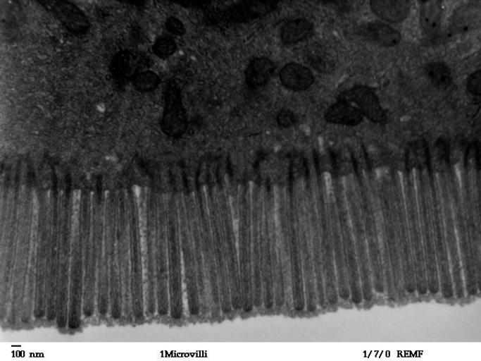 Keywords: Human jejunum microvilli 1 - TEM.jpg Transmission electron microscope image of a thin section cut through a human jejunum segment of small intestine epithelial cell Image shows apical end of absorptive cell with some of the densely packed microvilli that make up the striated border Each microvillus is approximately 1um long by 0 1um in diameter and contains a core of actin microfilaments JEOL 100CX TEM http //remf dartmouth edu/imagesindex html http //remf dartmouth edu/images/humanMicrovilliTEM/source/1 html Louisa Howard Katherine Connollly PD Louisa Howard and Katherine Connollly Cell biology Transmission electron microscopic images Microfilaments |
