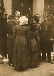 Keywords: suffrage the women's library thewomenslibrary women history politics hires monochrome 7JCC/O/02/008 Photograph, printed, paper, monochrome, suffragettes Daisy Solomon and Elspeth McClellan with a post boy, police and an official outside no.10 Downing Street, attempting to get themselves delivered as letters; printed inscription on reverse 'Copyright: World's Graphic Press Limited, 36-38 Whitefriars Street, Fleet Street, London. Please Acknowledge' 7JCC/O/02/008 Photograph, printed, paper, monochrome, suffragettes Daisy Solomon and Elspeth McClellan with a post boy, police and an official outside no.10 Downing Street, attempting to get themselves delivered as letters; printed inscription on reverse 'Copyright: World's Graphic Press Limited, 36-38 Whitefriars Street, Fleet Street, London. Please Acknowledge'