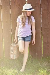 Keywords: human person girl hat barefoot luggage out nature fence wood portrait