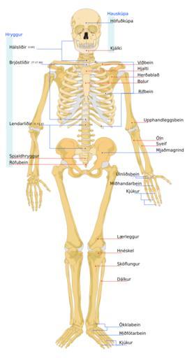 Keywords: Human skeleton front is.svg diagram of a human female skeleton with captions in Icelandic the Red lines point individual bones and the names are writen in singular the blue lines conect to group of bones and are in plural form made it myself 2007-01-03 LadyofHats Icelandic translation by Akigka LadyofHats Other versions/Human skeleton front Translation possible Anatomical plates and drawings of human bones SVG files on human skeleton Diagrams in Icelandic