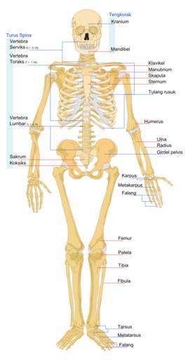 Keywords: Human skeleton front ms.svg red lines point individual bones blue lines connect to group of bones red Garisan menunjukkan tulang tunggal blue Garisan menunjukkan kelompok tulang Image Human skeleton front svg by LadyofHats Drew by Mariana Ruiz Malay translation by Tebu an 2008-12-26 LadyofHats Other versions/Human skeleton front Translation possible Anatomical plates and drawings of human bones SVG files on human skeleton