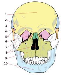 | Keywords: Human skull front bones numbered.svg numbered version of Image Human skull front bones svg made it myself 2007-01-06 LadyofHats Mariana Ruiz Villarreal <languages/> español + Skull front bones text-align right; vertical-align top Frontal bone 1 <br />Nasal bone 2 <br />Parietal bone 3 <br />Temporal bone 4 <br />Sphenoid bone 5 <br />Lacrimal bone 6 <br />Zygomatic bone 7 <br />Ethmoid bone up vomer down 8 <br />Maxilla 9 <br />Mandible 10 thumb center 150px Français + Os de la face du crâne text-align right; vertical-align top Os frontal 1 <br />Os nasal 2 <br />Os pariétal 3 <br />Os temporal 4 <br />Os sphénoïde 5 <br />Os lacrymal 6 <br />Os zygomatique 7 <br />Os éthmoïde haut vomer bas 8 <br />Maxillaire 9 <br />Mandibule 10 thumb center 150px SVG files on human skull |