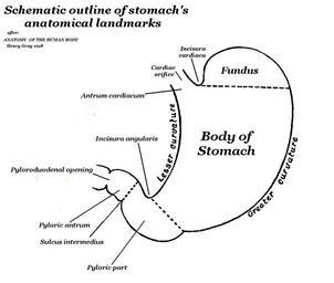 | Keywords: Human Stomach schematic external anatomy.jpg en Schematic outline of external anatomical landmarks of human stomach Illustrates Cardiac region Fundus Body and Pyloric regions 2014-10-31 16 55 48 Adapted from Gray's Anatomy of Human body 1918 also in much earlier editions Gray Henry other versions Source of diagram Gray's Anatomy of the Human Body 20th edition Re-annotated PD-old-70-1923 Uploaded with UploadWizard Stomachs Fundus | ||||
