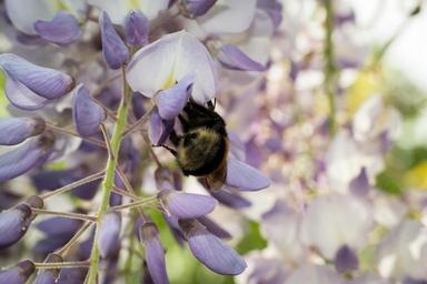 Keywords: hummel blue rain collect nectar flowers wisteria work hard working busy diligence trouble purple