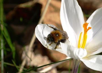 Keywords: hummel pollen close insect blossom bloom crocus white flowering stems