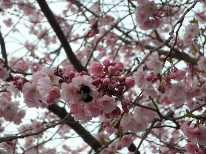 Keywords: hummel sprinkle ornamental cherry blossom bloom close flowers pink spring flight insect pollen nectar collect bloom
