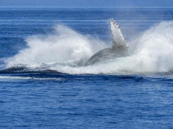 Keywords: humpback whale natural spectacle nature mammal animal wildlife jumping colossus aquatic ocean water splash pacific fin maritime life