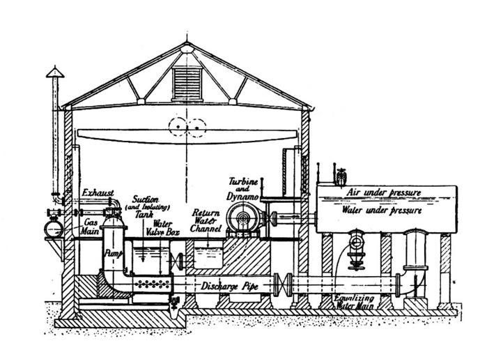 Keywords: Humphrey gas pump, electro-hydraulic generator (Rankin Kennedy, Modern Engines, Vol V).jpg Humphrey's Gas Pump is used to pump water into a pressure vessel Water under this pressure then drives a turbine to turn a dynamo and generate electricity Humphrey pumps