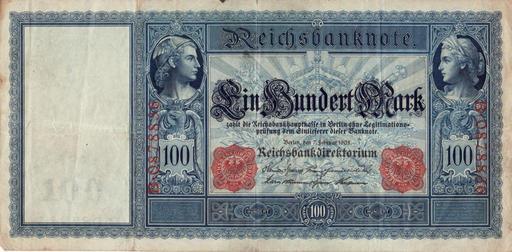 | Keywords: Hundert Mark b.jpg en German Goldmark Banknote de Reichsbanknote Sammlung und Scan Dr Alexander Mayer Deutsche Reichsbank 1908-02-07 PD-GermanGov-currency note PD-old-100 Mark banknotes of the German Empire 0100 19080206 Banknotes with a face value of 100 |