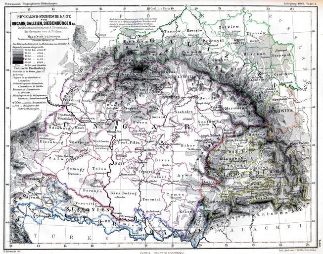 | Keywords: Hungary, Galicia and Transylvania.jpg Map of Hungary Galicia Transylvania Bukowina Croatia and Slavonia Petermanns Mitteilungen 1862 own scan PD-old Old maps of the Austrian Empire Maps in German Old maps of the Kingdom of Galicia Old maps of Bukovina Old maps of Transylvania Old maps of Hungary Old maps of Croatia Grand Principality of Transylvania 1862 maps |