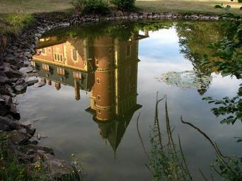Keywords: hungary parádsasvár famous castle tower building hotel tourism reflection water nature sky blue underwater windows green leaves stones yellow grey travel memory monument photographic picture attraction
