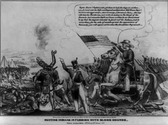 | Keywords: Hunting Indians in Florida With Bloodhounds.jpg en A tableau dramatizing the brutal tactics employed by Zachary Taylor as commander of U S forces against the Seminole Indians during the Second Seminole War 1835-42 Taylor on horseback at right presides over a scene of devastation and carnage Soldiers aided by bloodhounds relentlessly pursue retreating Seminoles including a multitude of women and children who flee in panic to the left A wounded dog lies on the ground in the lower right while another lunges at the throat of a Seminole brave who shields a woman and child at left A village burns in the distance In the center an officer standing with his back to the viewer points out the slaughter to Taylor who exclaims Hurra Captain we've got them at last the dogs are at them--now forward with the Rifle and Bayonet and give them Hell Brave Boys let not a red nigger escape- show no mercy- exterminate them -this day we'll close the Florida War and write its history in the blood of the Seminole--but remember Captn as I have written to our Government to say that the dogs are intended to ferret out the Indians not to worry them for the sake of consistency and the appearance of Humanity you will appear not to notice the devastation they commit 1848 Library of Congress http //www loc gov/pictures/item/2008661482/ James Baillie other versions PD-old-70-1923 Uploaded with UploadWizard Seminole Wars |