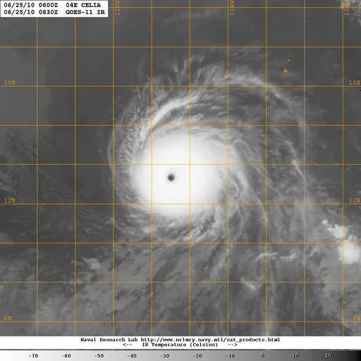 Keywords: Hurricane Celia 2010 at peak intensity.jpg en Infrared satellite image of Hurricane Celia as a Category 5 hurricane on June 25 2010 http //199 9 2 143/tcdat/tc10/EPAC/04E CELIA/ir/geo/1km_bw/ United States Navy 2010-06-25 Public Domain Hurricane Celia 2010 PD-USGov-Military-Navy |
