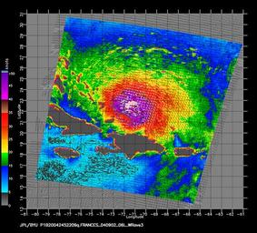| Keywords: Hurricane Frances, Natural Hazards DVIDS752630.jpg en <p>The SeaWinds scatterometer aboard NASA's QuikSCAT satellite collected the data used to create this colorful image of hurricane Frances as it approached Cuba on September 1 2004 at 6 09 p m EDT The colored background shows the near-surface wind speeds at 2 5 km resolution The strongest winds shown in purple are at the center of the storm with gradually weakening winds forming rings around the center The black barbs indicate wind speed and direction at QuikSCAT's nominal 25 km resolution; white barbs indicate areas of heavy rain The black grid over the image show degrees of latitude and longitude The vertical lines of longitude start at 77 West on the left and run to 65 on the right The horizontal lines of latitude start at 18 North on the bottom and run to 27 North on top </p> <p>NASA's Quick Scatterometer winds jpl nasa gov QuikSCAT spacecraft was launched from Vandenberg Air Force Base California on June 19 1999 QuikScat carries the SeaWinds scatterometer a specialized microwave radar that measures near-surface wind speed and direction under all weather and cloud conditions over the Earth's oceans </p> <p>In recent years the ability to detect and track severe storms has been dramatically enhanced by the advent of weather satellites Data from the SeaWinds scatterometer is augmenting traditional satellite images of clouds by providing direct measurements of surface winds to compare with the observed cloud patterns in an effort to better determine a hurricane's location direction structure and strength Specifically these wind data are helping meteorologists to more accurately identify the extent of gale-force winds associated with a storm while supplying inputs to numerical models that provide advanced warning of high waves and flooding </p><p>NASA image courtesy the winds jpl nasa gov QuikSCAT team at NASA's Jet Propulsion Laboratory </p> NASA Identifier Frances_QST_2004246 <br>Unit NASA 2011-07-25 Glenn Research Center https //www dvidshub net/image/752630/hurricane-frances-natural-hazards 752630 2012-10-19 15 55 WASHINGTON DC US PD-USGov Vandenberg Air Force Base Images from DoD uploaded by Fæ |