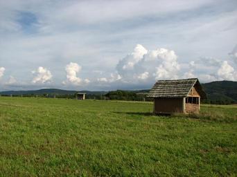 Keywords: hut pasture meadow log cabin eifel hike landscape sky storm clouds blue green plateau martberg pommerer pomeranian mosel