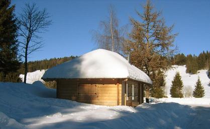 Keywords: hut roof winter snow black forest bank trees firs fir frosty icy landscape idyll fir forest snowy nature road