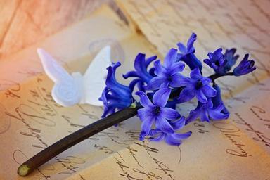 Keywords: hyacinth flower blossom bloom blue fragrant flower fragrant spring flower deco butterfly letters old antique handwriting romantic close