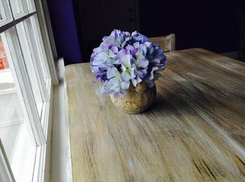 Keywords: hydrangea flowers purple rustic wood table window