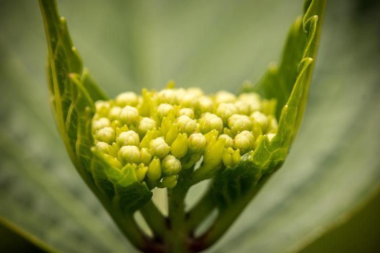 Keywords: hydrangea young blossom bloom frisch green macro leaves bud structure