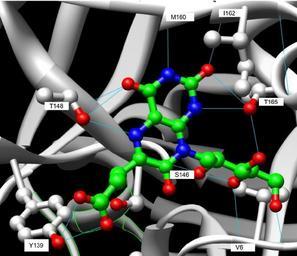 | Keywords: Hydrogen Bonding C-Terminal Domain.jpg en Hydrogen Bonding at the C-Terminal Domain of Riboflavin Synthase PDB 1Kzl Organism S Pombe substrate carboxyethyllumazine Own PERod 12/11/08 Check categories 2008 December 19 en wikipedia Riboflavin_synthase Enzymes |