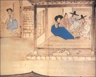 | Keywords: Hyewon-Hongru.daeju.jpg 홍루 주 紅樓待酒 ' 원풍속도첩 蕙 風俗 帖 ' 중에 울 성북구 간송미술 소장 Waiting for drinks being served at a hongru traslit title Hongru daeju from Hyewon pungsokdo by 19th-century Korean painter Hyewon Original stored at Gansong Art Museum in Seoul South Korea http //jeonlado com/v2/ch03 html number 8044 1805년 후 작품 추정 presumed after 1805 원 신 복 申潤福 1758-19세기 초반 Shin Yunbok or Hyewon his pen name 1758- early 19c Hyewon pungsokdo Kisaeng PD-old | ||||