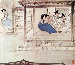 | Keywords: Hyewon-Hongru.daeju-c01.jpg 홍루 주 紅樓待酒 ' 원풍속도첩 蕙 風俗 帖 ' 중에 울 성북구 간송미술 소장 Waiting for drinks being served at a hongru traslit title Hongru daeju from Hyewon pungsokdo by 19th-century Korean painter Hyewon Original stored at Gansong Art Museum in Seoul South Korea http //www dgdowon es kr/cgi-bin/bbs/zboard php id artlove_2006_57 page 10 sn1 divpage 1 sn off ss on sc on select_arrange headnum desc asc no 80 1805년 후 작품 추정 presumed after 1805 원 신 복 申潤福 1758-19세기 초반 Shin Yunbok or Hyewon his pen name 1758- early 19c Hyewon pungsokdo Kisaeng PD-old |