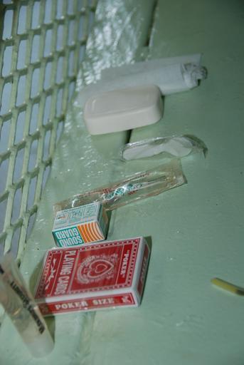 | Keywords: Hygiene items for camp 1 captives, Guantanamo.jpg en GUANTANAMO BAY Cuba “ Hygiene items given to detainees at Joint Task Force Guantanamo include soap shampoo a toothbrush toothpaste and toilet paper Detainees also receive earplugs and one pack of playing cards regardless of compliancy or camp location July 25 2007 JTF Guantanamo photo by Army Sgt Joseph Scozzari http //www jtfgtmo southcom mil/virtualvisit/camp_1 html Joseph Scozzari 2007-07-25 PD-USGov-Military-Navy Camp 1 Guantanamo Toiletries |