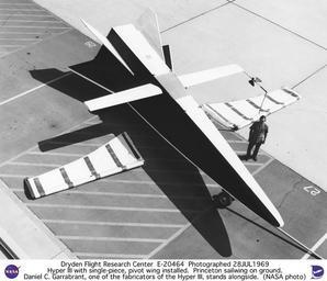 | Keywords: Hyper III on ramp with single-piece pivot wing installed & Princeton sailwing on ground, with Da DVIDS738879.jpg en The Hyper III's shape provided too little lift to land without some type of deployable wing The single free flight was made using a simulated one-piece pivot wing which was attached to the upper surface of the fuselage This used a wing kit from an HP-11 sailplane which was assembled by Daniel Garrabrant shown in the photo Another possible wing was the Flexible Princeton Sailwing The piloted Hyper III flights were to be made using an SA-16B Albatross seaplane as the drop aircraft The Hyper III would be carried under the SA-16B's wing on a drop-tank rack Flight Research Center Director Paul Bikle asked NASA Headquarters for permission to exchange the Center's C-47 for the SA-16 Headquarters turned down this request effectively ending the possibility of Hyper III flights with a pilot on board The Flight Research Center FRC--as Dryden was named from 1959 until 1976 already had experience with testing small-scale aircraft using model-airplane techniques but the first true remotely piloted research vehicle was the Hyper III which flew only once in December 1969 At that time the Center was engaged in flight research with a variety of reentry shapes called lifting bodies and there was a desire both to expand the flight research experience with maneuverable reentry vehicles including a high-performance variable-geometry craft and to investigate a remotely piloted flight research technique that made maximum use of a research pilot's skill and experience by placing him in the loop as if he were in the cockpit There have been as yet no female research pilots assigned to Dryden The Hyper III as originally conceived was a stiletto-shaped lifting body that had resulted from a study at NASA's Langley Research Center in Hampton Virginia It was one of a number of hypersonic cross-range reentry vehicles studied at Langley Hypersonic means Mach 5--five times the speed of sound--or faster; cross-range means able to fly a considerable distance to the left or right of the initial reentry path The FRC added a small deployable skewed wing to compensate for the shape's extremely low glide ratio Shop personnel built the 32-foot-long Hyper III and covered its tubular frame with dacron aluminum and fiberglass for about 6 500 Hyper III employed the same 8-ball attitude indicator developed for control-room use when flying the X-15 two model-airplane receivers to command the vehicle's hydraulic controls and a telemetry system surplus from the X-15 program to transmit 12 channels of data to the ground not only for display and control but for data analysis Dropped from a helicopter at 10 000 feet Hyper III flew under the control of research pilot Milt Thompson to a near landing using instruments for control When the vehicle was close to the ground he handed the vehicle off to experienced model pilot Dick Fischer for a visual landing using standard controls The flight demonstrated the feasibility of remotely piloting research vehicles and among other things that control of the vehicle in roll was much better than predicted and that the vehicle had a much lower lift-to-drag ratio than predicted a maximum of 4 0 rather than 5 0 Pilot Milt Thompson exhibited some suprising reactions during the Hyper III flight; he behaved as if he were in the cockpit of an actual research aircraft I was really stimulated emotionally and physically in exactly the same manner that I have been during actual first flights Flying the Hyper III from a ground cockpit was just as dramatic as an actual flight in any of the other vehicles responsibility rather than fear of personal safety is the real emotional driver I have never come out of a simulator emtionally and physically tired as is often the case after a test flight in a research aircraft I was emotionally and physically tired after a 3-minute flight of the Hyper III NASA Identifier NIX-E-20464 2009-09-23 Glenn Research Center https //www dvidshub net/image/738879 738879 2012-10-18 00 22 WASHINGTON DC US PD-USGov Langley Research Center Images from DoD uploaded by Fæ |