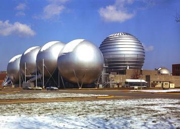 | Keywords: outdoor (1969-L-02164): This winter 1969 view, complete with a dusting of snow, illustrates how the large vacuum spheres dominate the Hypersonic Facilities Complex. They are 41, 60, and 100 feet in diameter. Spheres were used because their double-curved surfaces strongly resist buckling inward, making them the most structurally efficient shape for large vacuum vessels. (1969-L-02164): This winter 1969 view, complete with a dusting of snow, illustrates how the large vacuum spheres dominate the Hypersonic Facilities Complex. They are 41, 60, and 100 feet in diameter. Spheres were used because their double-curved surfaces strongly resist buckling inward, making them the most structurally efficient shape for large vacuum vessels. |