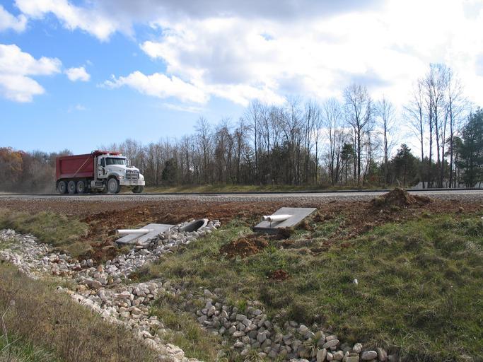 | Keywords: i-69 i69 interstate 69 interstate69 indiana monroe county monroecounty road interstate construction freeway paving infrastructure e. s. wagner co. eswagnerco riprap drainage pvc piping pvcpiping A Mack tri-axle dump truck transports a load of riprap (large, bucket-sized rocks) to an Interstate 69 construction zone near Rockport Road in Monroe County, Indiana; looking southeast from near Lodge Road. In the foreground are ravines lined with riprap to ensure proper drainage from the road and nearby embankments. The three drainage outlets pictured each drain water from different parts of the road. The large middle outlet drains water from the median, while the two PVC piping outlets with concrete headwalls serve to drain water from the road's subbase. Completing construction, the PVC pipes will be cut flush to the headwalls and animal guards inserted in the tubes. E. S. Wagner Co., prime contractor (Indiana I-69 Project, Section 4, Segment 8). A Mack tri-axle dump truck transports a load of riprap (large, bucket-sized rocks) to an Interstate 69 construction zone near Rockport Road in Monroe County, Indiana; looking southeast from near Lodge Road. In the foreground are ravines lined with riprap to ensure proper drainage from the road and nearby embankments. The three drainage outlets pictured each drain water from different parts of the road. The large middle outlet drains water from the median, while the two PVC piping outlets with concrete headwalls serve to drain water from the road's subbase. Completing construction, the PVC pipes will be cut flush to the headwalls and animal guards inserted in the tubes. E. S. Wagner Co., prime contractor (Indiana I-69 Project, Section 4, Segment 8). |