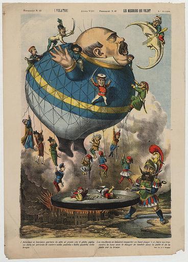 | Keywords: I volatori. Les messieurs qui volent.jpg Italian political cartoon shows a large balloon Politica in the shape of a man ready to gobble up the moon Oriente defended by a man Turco holding a fork Other armed men representing the nations of Europe and North Africa are falling off the balloon into the frying pan of war Guerra held by the Roman god Mars Marte it Descrizione originale I fiduciosi si lasciano portare in alto al punto che il globo piglia un foro col pericolo di cadere nella padella e dalla padella nelle bragie originelle Les confiants se laissent emporter en haut jusqu á se faire un trou contre la lune avec le danger de tomber dans la poële et de la poële sur la braise LOC-image ppmsca 02356 Italy Stab lit di P Barigazzi 1880 1880 http //lcweb2 loc gov/cgi-bin/query/D ils 6 /temp/~pp_jtUq mdb fsaall brum detr swann look gottscho pan horyd genthe var cai cd hh yan lomax ils prok brhc nclc matpc iucpub tgmi lamb hec krb PD-Old 1880 magazines 1880 cartoons 1880s political cartoons Balloon aircraft in art 1880 |