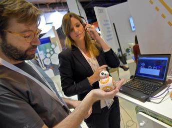 | Keywords: indoor IBM ha creado una aplicación sobre la plataforma de desarrollo en la nube Bluemix que permite controlar el famoso robot de la última película de la Guerra de las Galaxias. La app, instalada en un dispositivo móvil (smartphone o tableta), permite mover e interactuar con el robot con la voz gracias a los servicios de reconocimiento de lenguaje natural de Watson en Bluemix y a la tecnología de Internet of Things de IBM. En la imagen, Chemi Ordax, especialista en IBM Bluemix, y María Borbonés, técnico en soluciones de movilidad y cloud de IBM. Más información en www.ibm.biz/ibm-des Síguenos a través de Twitter en #IBMDES #DES2016 Copyright: IBM España IBM ha creado una aplicación sobre la plataforma de desarrollo en la nube Bluemix que permite controlar el famoso robot de la última película de la Guerra de las Galaxias. La app, instalada en un dispositivo móvil (smartphone o tableta), permite mover e interactuar con el robot con la voz gracias a los servicios de reconocimiento de lenguaje natural de Watson en Bluemix y a la tecnología de Internet of Things de IBM. En la imagen, Chemi Ordax, especialista en IBM Bluemix, y María Borbonés, técnico en soluciones de movilidad y cloud de IBM. Más información en www.ibm.biz/ibm-des Síguenos a través de Twitter en #IBMDES #DES2016 Copyright: IBM España |