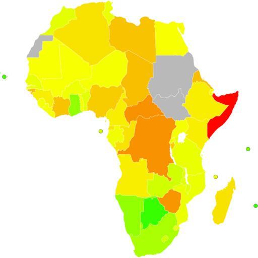 | Keywords: Ibrahim-index-of-african-governance-rule-of-law.svg Editor note This map is saved in human-editable plain text format Please do not upload edits saved with Inkscape or similar editors Ibrahim Index of African Governance legend 00ff00 100 80ff00 75 ffff00 50 ff8000 25 ff0000 0 e0e0e0 no data A country with a score X between 0 and 50 is coloured rgb 255 255X/50 0 A country with a score X between 50 and 100 is coloured rgb 255 100-X /50 255 0 This leads to a country with score of 0 being coloured red a country with a score of 50 being coloured yellow and a country with a score of 100 being coloured green The source data from the 2013 report can be found here http //www moibrahimfoundation org/interact/ srl;root Feel free to update this map as new data become available but please retain the current liberal licensing terms Based on File BlankMap-Africa svg Stephen Morley 2010-07-25 <gallery>File Ibrahim-index-of-african-governance svg Overall scores on the Ibrahim Index of African Governance</gallery> cc-zero Demographic maps |