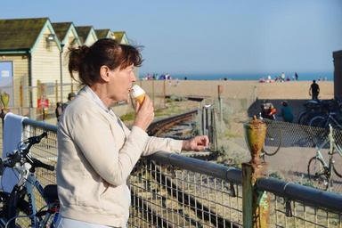 Keywords: ice cream eating tourist lady woman britain english beach uk holiday summer tourism coastline travel vacation europe brighton england british seaside resort