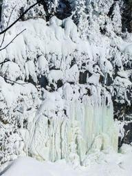 Keywords: ice waterfall frozen winter landscape rocky wall snow cold season nature frost white sunny day scenic ice columns