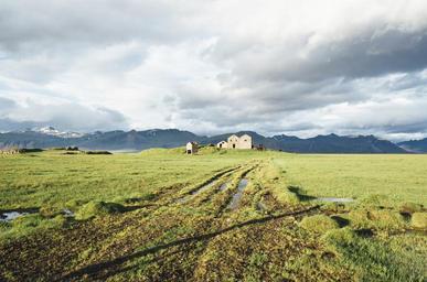 Keywords: iceland farm field grass country mountains cliffs sky clouds rocks