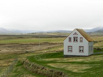 Keywords: iceland landscape nature grass green hut grass roof flat